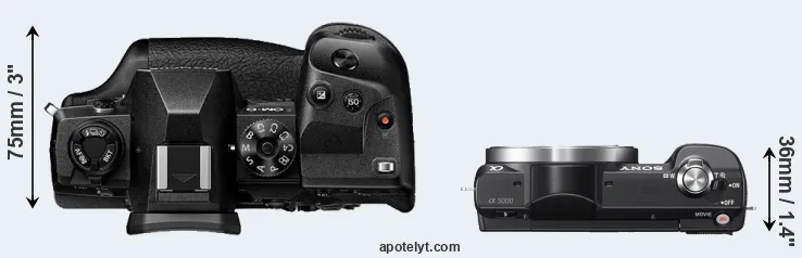 An illustration of the physical size and weight of the Olympus E-M1X and the Sony A5000 is provided in the side-by-side display below. The two cameras are presented according to their relative size. Three consecutive views from the front, the top, and the rear side are shown. All width, height and depth measures are rounded to the nearest millimeter.