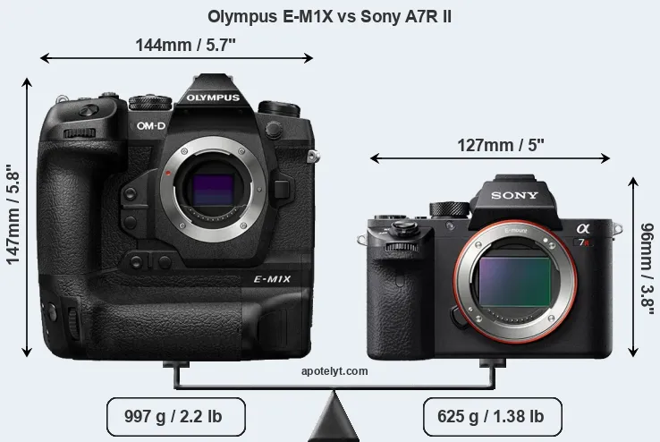 An illustration of the physical size and weight of the Olympus E-M1X and the Sony A7R II is provided in the side-by-side display below. The two cameras are presented according to their relative size. Three consecutive perspectives from the front, the top, and the back are available. All size dimensions are rounded to the nearest millimeter.