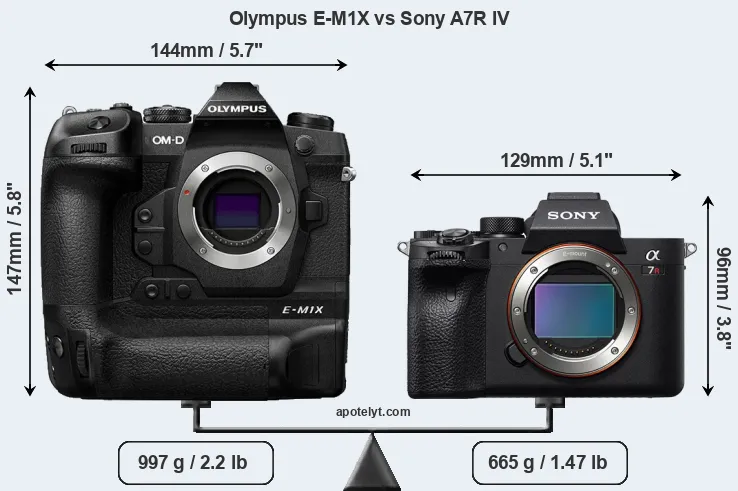 The physical size and weight of the Olympus E-M1X and the Sony A7R IV are illustrated in the side-by-side display below. The two cameras are presented according to their relative size. Three consecutive perspectives from the front, the top, and the back are available. All width, height and depth dimensions are rounded to the nearest millimeter.