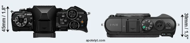If the front view area (width x height) of the cameras is taken as an aggregate measure of their size, the Olympus E-PL10 is notably smaller (25 percent) than the Olympus E-M5 II. Moreover, the E-PL10 is markedly lighter (19 percent) than the E-M5 II. It is worth mentioning in this context that the E-M5 II is splash and dust resistant, while the E-PL10 does not feature any corresponding weather-sealing.