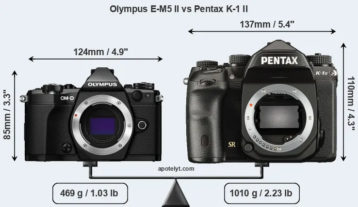 If the front view area (width x height) of the cameras is taken as an aggregate measure of their size, the Pentax K-1 II is considerably larger (43 percent) than the Olympus E-M5 II. Moreover, the K-1 II is substantially heavier (115 percent) than the E-M5 II. In this context, it is worth noting that both cameras are splash and dust-proof and can, hence, be used in inclement weather conditions or harsh environments.