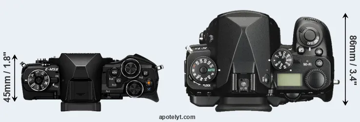 The physical size and weight of the Olympus E-M5 II and the Pentax K-1 II are illustrated in the side-by-side display below. The two cameras are presented according to their relative size. Three consecutive perspectives from the front, the top, and the back are available. All size dimensions are rounded to the nearest millimeter.