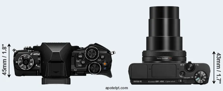 If the front view area (width x height) of the cameras is taken as an aggregate measure of their size, the Sony RX100 VI is considerably smaller (44 percent) than the Olympus E-M5 II. It is worth mentioning in this context that the E-M5 II is splash and dust resistant, while the RX100 VI does not feature any corresponding weather-sealing.