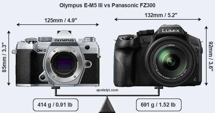 The physical size and weight of the Olympus E-M5 III and the Panasonic FZ300 are illustrated in the side-by-side display below. The two cameras are presented according to their relative size. Three consecutive perspectives from the front, the top, and the back are available. All width, height and depth dimensions are rounded to the nearest millimeter.