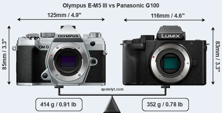 The physical size and weight of the Olympus E-M5 III and the Panasonic G100 are illustrated in the side-by-side display below. The two cameras are presented according to their relative size. Three consecutive perspectives from the front, the top, and the back are available. All width, height and depth dimensions are rounded to the nearest millimeter.