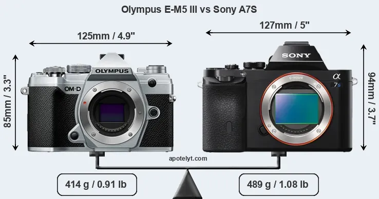 An illustration of the physical size and weight of the Olympus E-M5 III and the Sony A7S is provided in the side-by-side display below. The two cameras are presented according to their relative size. Three successive views from the front, the top, and the rear are shown. All size dimensions are rounded to the nearest millimeter.