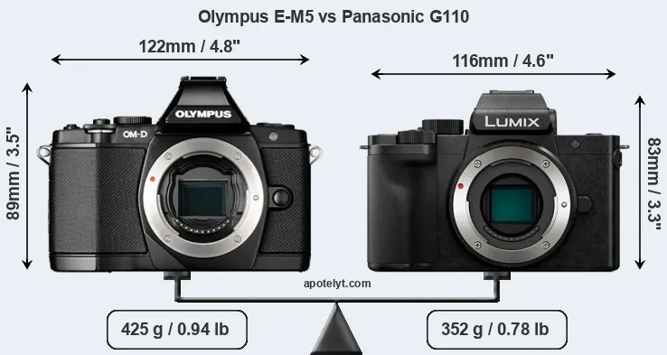 If the front view area (width x height) of the cameras is taken as an aggregate measure of their size, the Panasonic G110 is notably smaller (11 percent) than the Olympus E-M5. Moreover, the G110 is markedly lighter (17 percent) than the E-M5. It is worth mentioning in this context that the E-M5 is splash and dust resistant, while the G110 does not feature any corresponding weather-sealing.