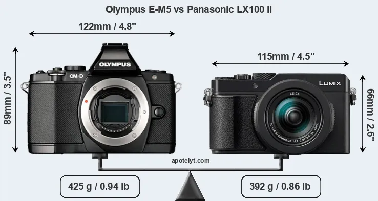 The side-by-side display below illustrates the physical size and weight of the Olympus E-M5 and the Panasonic LX100 II. The two cameras are presented according to their relative size. Three consecutive perspectives from the front, the top, and the back are available. All width, height and depth dimensions are rounded to the nearest millimeter.