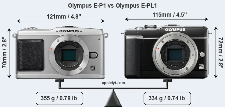 An illustration of the physical size and weight of the Olympus E-P1 and the Olympus E-PL1 is provided in the side-by-side display below. The two cameras are presented according to their relative size. Three consecutive perspectives from the front, the top, and the back are available. All size dimensions are rounded to the nearest millimeter.