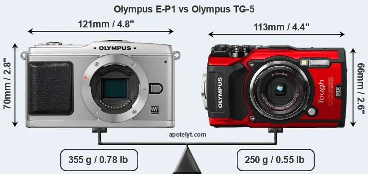 If the front view area (width x height) of the cameras is taken as an aggregate measure of their size, the Olympus TG-5 is notably smaller (12 percent) than the Olympus E-P1. It is noteworthy in this context that the TG-5 is splash and dust-proof, while the E-P1 does not feature any corresponding weather-sealing. More than that, the TG-5 is water-proof up to 15m and can, thus, be used for underwater photography.