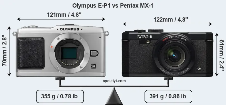 The physical size and weight of the Olympus E-P1 and the Pentax MX-1 are illustrated in the side-by-side display below. The two cameras are presented according to their relative size. Three consecutive perspectives from the front, the top, and the back are available. All width, height and depth measures are rounded to the nearest millimeter.