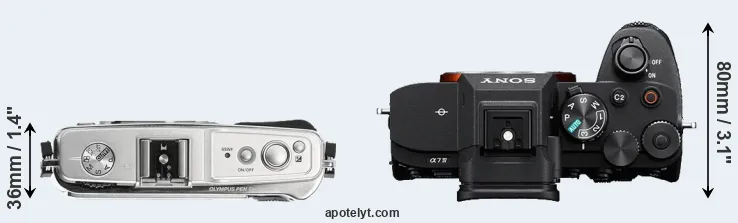 The physical size and weight of the Olympus E-P1 and the Sony A7 IV are illustrated in the side-by-side display below. The two cameras are presented according to their relative size. Three successive views from the front, the top, and the rear are shown. All size dimensions are rounded to the nearest millimeter.