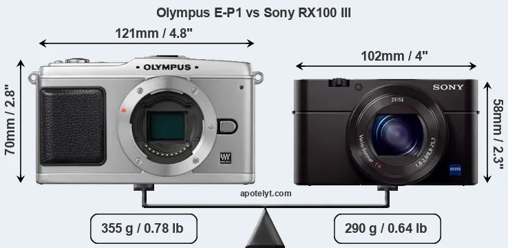 If the front view area (width x height) of the cameras is taken as an aggregate measure of their size, the Sony RX100 III is considerably smaller (30 percent) than the Olympus E-P1. In this context, it is worth noting that neither the E-P1 nor the RX100 III are weather-sealed.