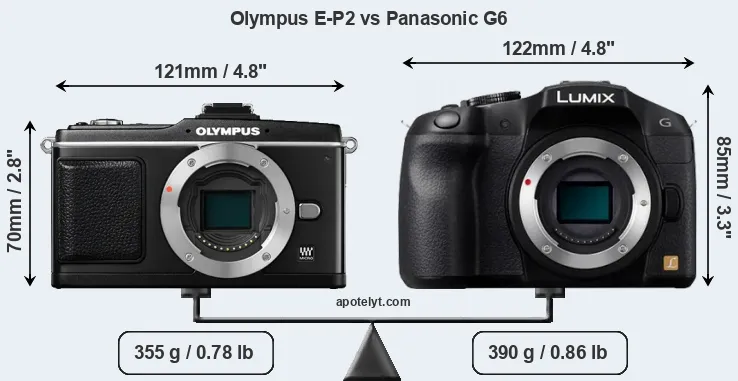If the front view area (width x height) of the cameras is taken as an aggregate measure of their size, the Panasonic G6 is notably larger (22 percent) than the Olympus E-P2. Moreover, the G6 is markedly heavier (10 percent) than the E-P2. In this context, it is worth noting that neither the E-P2 nor the G6 are weather-sealed.