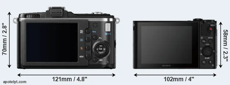 If the front view area (width x height) of the cameras is taken as an aggregate measure of their size, the Sony HX90V is considerably smaller (30 percent) than the Olympus E-P2. In this context, it is worth noting that neither the E-P2 nor the HX90V are weather-sealed.