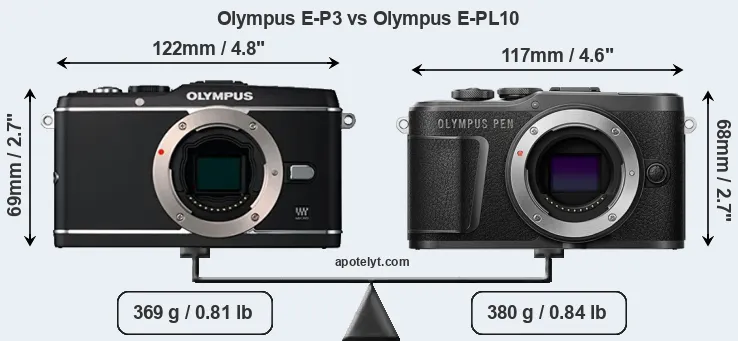 The side-by-side display below illustrates the physical size and weight of the Olympus E-P3 and the Olympus E-PL10. The two cameras are presented according to their relative size. Three consecutive perspectives from the front, the top, and the back are available. All width, height and depth dimensions are rounded to the nearest millimeter.