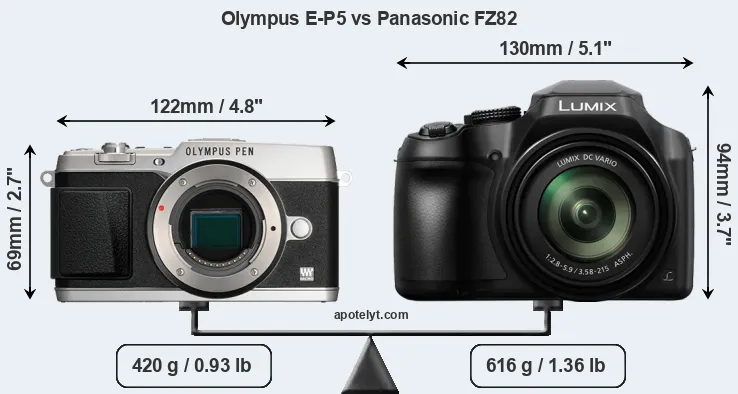 The side-by-side display below illustrates the physical size and weight of the Olympus E-P5 and the Panasonic FZ82. The two cameras are presented according to their relative size. Three consecutive perspectives from the front, the top, and the back are available. All width, height and depth measures are rounded to the nearest millimeter.