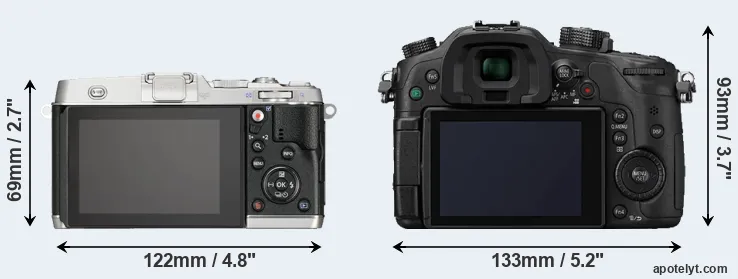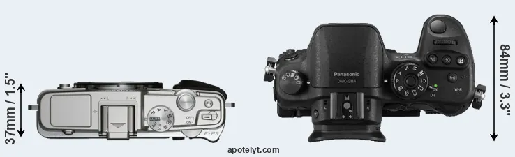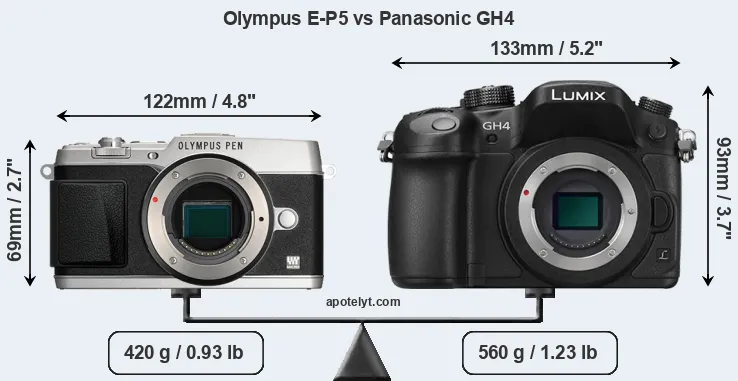 The side-by-side display below illustrates the physical size and weight of the Olympus E-P5 and the Panasonic GH4. The two cameras are presented according to their relative size. Three consecutive perspectives from the front, the top, and the back are available. All width, height and depth dimensions are rounded to the nearest millimeter.