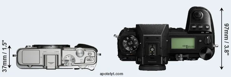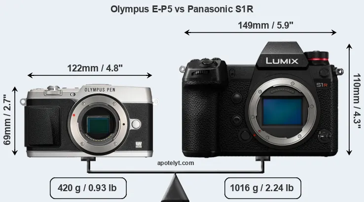 The side-by-side display below illustrates the physical size and weight of the Olympus E-P5 and the Panasonic S1R. The two cameras are presented according to their relative size. Three consecutive views from the front, the top, and the rear side are shown. All width, height and depth measures are rounded to the nearest millimeter.