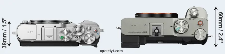 If the front view area (width x height) of the cameras is taken as an aggregate measure of their size, the Sony A7C is notably larger (8 percent) than the Olympus E-P7. Moreover, the A7C is substantially heavier (51 percent) than the E-P7. It is noteworthy in this context that the A7C is splash and dust-proof, while the E-P7 does not feature any corresponding weather-sealing.