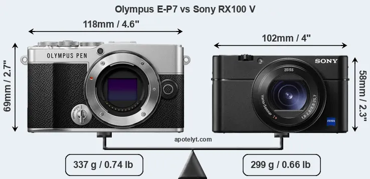 The side-by-side display below illustrates the physical size and weight of the Olympus E-P7 and the Sony RX100 V. The two cameras are presented according to their relative size. Three successive views from the front, the top, and the rear are shown. All size dimensions are rounded to the nearest millimeter.