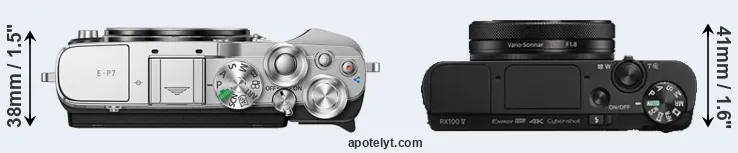 The above size and weight comparisons are to some extent incomplete and possibly misleading, as the RX100 V has a lens built in, whereas the E-P7 is an interchangeable lens camera that requires a separate lens. Attaching the latter will add extra weight and bulk to the setup. You can compare the optics available for the E-P7 and their specifications in the Micro Four Thirds Lens Catalog.
