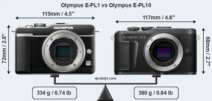 An illustration of the physical size and weight of the Olympus E-PL1 and the Olympus E-PL10 is provided in the side-by-side display below. The two cameras are presented according to their relative size. Three successive views from the front, the top, and the rear are shown. All width, height and depth measures are rounded to the nearest millimeter.