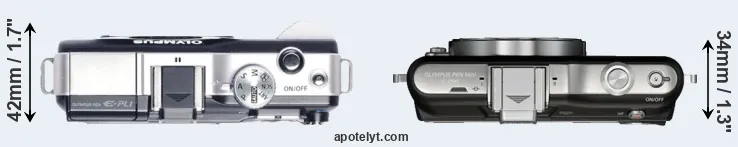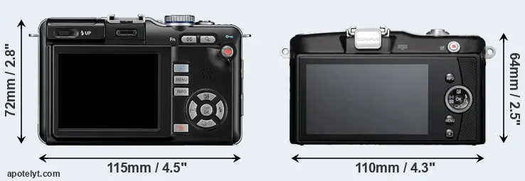 The side-by-side display below illustrates the physical size and weight of the Olympus E-PL1 and the Olympus E-PM1. The two cameras are presented according to their relative size. Three consecutive views from the front, the top, and the rear side are shown. All width, height and depth dimensions are rounded to the nearest millimeter.