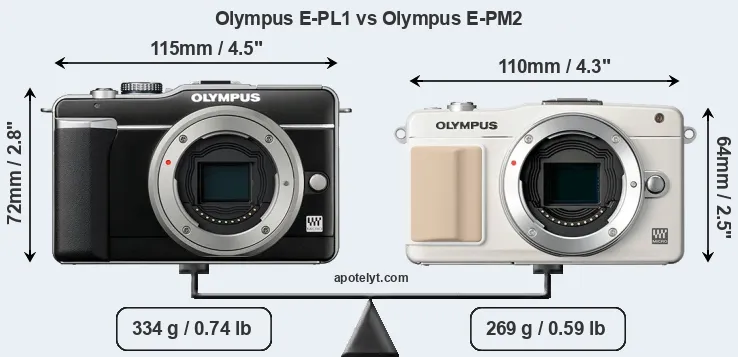 An illustration of the physical size and weight of the Olympus E-PL1 and the Olympus E-PM2 is provided in the side-by-side display below. The two cameras are presented according to their relative size. Three successive views from the front, the top, and the rear are shown. All width, height and depth dimensions are rounded to the nearest millimeter.