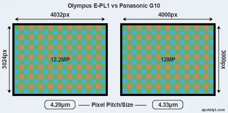 While the two cameras under review share the same sensor size, the E-PL1 offers a slightly higher resolution of 12.2 megapixels, compared with 12 MP of the G10. This megapixels advantage translates into a 0.8 percent gain in linear resolution. On the other hand, these sensor specs imply that the E-PL1 has a higher pixel density and a smaller size of the individual pixel (with a pixel pitch of 4.29μm versus 4.33μm for the G10). It is noteworthy in this context that the two cameras were released in close succession, so that their sensors are from the same technological generation.