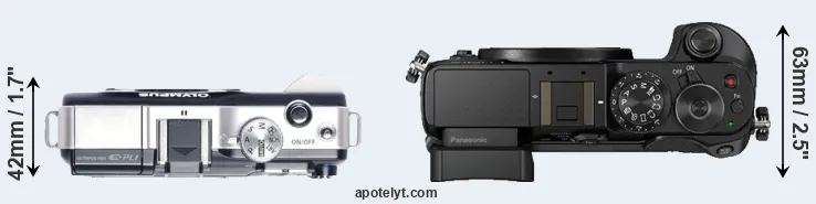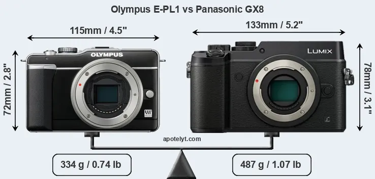 The side-by-side display below illustrates the physical size and weight of the Olympus E-PL1 and the Panasonic GX8. The two cameras are presented according to their relative size. Three consecutive perspectives from the front, the top, and the back are available. All width, height and depth dimensions are rounded to the nearest millimeter.