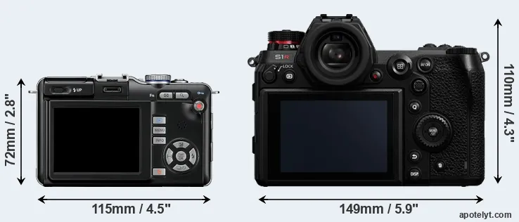 An illustration of the physical size and weight of the Olympus E-PL1 and the Panasonic S1R is provided in the side-by-side display below. The two cameras are presented according to their relative size. Three consecutive perspectives from the front, the top, and the back are available. All width, height and depth dimensions are rounded to the nearest millimeter.