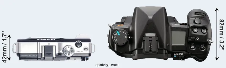 The side-by-side display below illustrates the physical size and weight of the Olympus E-PL1 and the Sony A900. The two cameras are presented according to their relative size. Three consecutive perspectives from the front, the top, and the back are available. All width, height and depth dimensions are rounded to the nearest millimeter.
