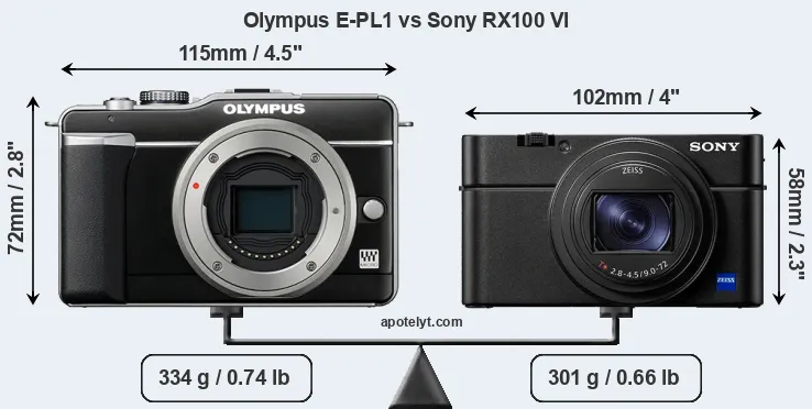 An illustration of the physical size and weight of the Olympus E-PL1 and the Sony RX100 VI is provided in the side-by-side display below. The two cameras are presented according to their relative size. Three consecutive perspectives from the front, the top, and the back are available. All size dimensions are rounded to the nearest millimeter.
