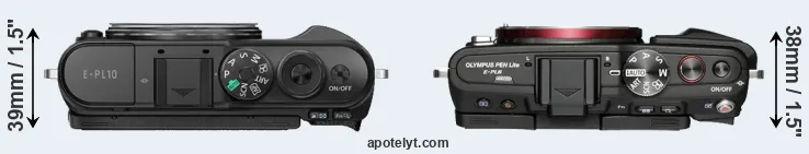 An illustration of the physical size and weight of the Olympus E-PL10 and the Olympus E-PL6 is provided in the side-by-side display below. The two cameras are presented according to their relative size. Three successive views from the front, the top, and the rear are shown. All width, height and depth measures are rounded to the nearest millimeter.