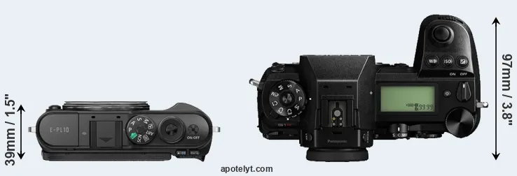 The physical size and weight of the Olympus E-PL10 and the Panasonic S1R are illustrated in the side-by-side display below. The two cameras are presented according to their relative size. Three consecutive views from the front, the top, and the rear side are shown. All width, height and depth measures are rounded to the nearest millimeter.