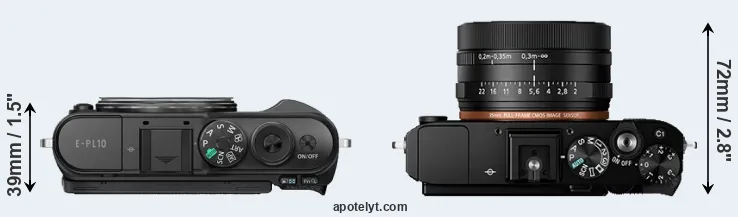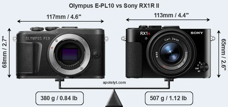 An illustration of the physical size and weight of the Olympus E-PL10 and the Sony RX1R II is provided in the side-by-side display below. The two cameras are presented according to their relative size. Three successive views from the front, the top, and the rear are shown. All size dimensions are rounded to the nearest millimeter.