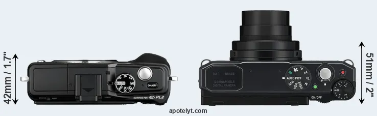 The side-by-side display below illustrates the physical size and weight of the Olympus E-PL2 and the Pentax MX-1. The two cameras are presented according to their relative size. Three consecutive views from the front, the top, and the rear side are shown. All width, height and depth dimensions are rounded to the nearest millimeter.