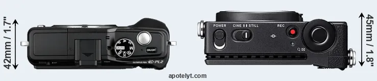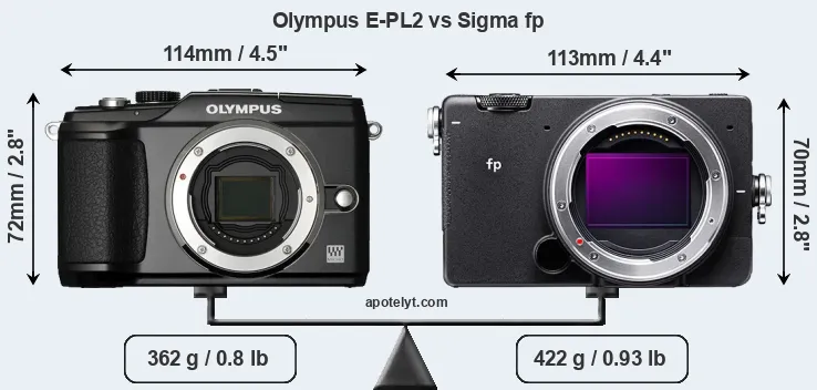 The side-by-side display below illustrates the physical size and weight of the Olympus E-PL2 and the Sigma fp. The two cameras are presented according to their relative size. Three consecutive perspectives from the front, the top, and the back are available. All size dimensions are rounded to the nearest millimeter.
