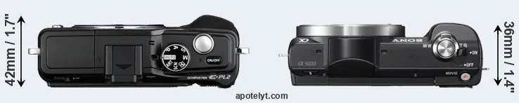 The physical size and weight of the Olympus E-PL2 and the Sony A5000 are illustrated in the side-by-side display below. The two cameras are presented according to their relative size. Three consecutive perspectives from the front, the top, and the back are available. All width, height and depth dimensions are rounded to the nearest millimeter.