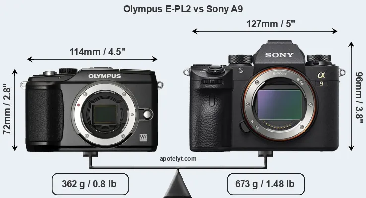 An illustration of the physical size and weight of the Olympus E-PL2 and the Sony A9 is provided in the side-by-side display below. The two cameras are presented according to their relative size. Three consecutive views from the front, the top, and the rear side are shown. All width, height and depth measures are rounded to the nearest millimeter.
