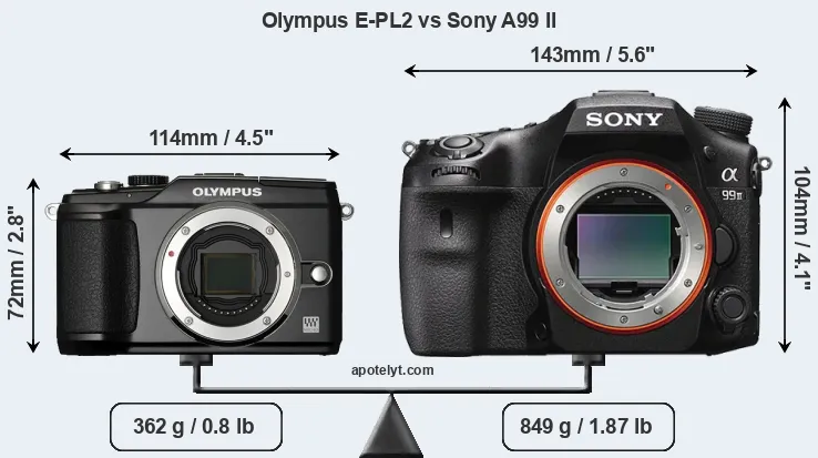 The physical size and weight of the Olympus E-PL2 and the Sony A99 II are illustrated in the side-by-side display below. The two cameras are presented according to their relative size. Three consecutive views from the front, the top, and the rear side are shown. All size dimensions are rounded to the nearest millimeter.