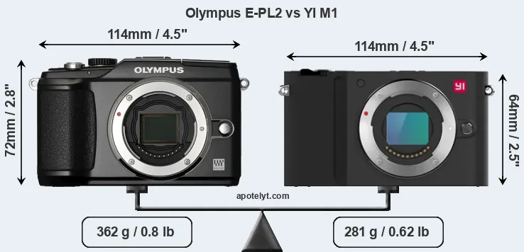 The physical size and weight of the Olympus E-PL2 and the YI M1 are illustrated in the side-by-side display below. The two cameras are presented according to their relative size. Three successive views from the front, the top, and the rear are shown. All width, height and depth measures are rounded to the nearest millimeter.