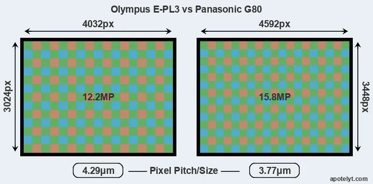 While the two cameras under review share the same sensor size, the G80 offers a higher resolution of 15.8 megapixels, compared with 12.2 MP of the E-PL3. This megapixels advantage translates into a 14 percent gain in linear resolution. On the other hand, these sensor specs imply that the G80 has a higher pixel density and a smaller size of the individual pixel (with a pixel pitch of 3.77μm versus 4.29μm for the E-PL3). However, it should be noted that the G80 is much more recent (by 5 years and 2 months) than the E-PL3, and its sensor will have benefitted from technological advances during this time that compensate for the smaller pixel size. Coming back to sensor resolution, it should be mentioned that the G80 has no anti-alias filter installed, so that it can capture all the detail its sensor resolves.