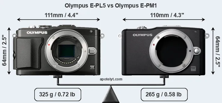 The physical size and weight of the Olympus E-PL5 and the Olympus E-PM1 are illustrated in the side-by-side display below. The two cameras are presented according to their relative size. Three consecutive views from the front, the top, and the rear side are shown. All width, height and depth measures are rounded to the nearest millimeter.