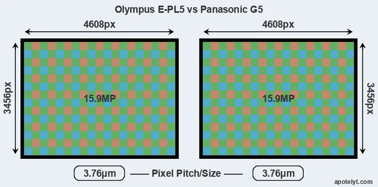 The two cameras under review do not only share the same sensor size, but also offer an identical resolution of 15.9 megapixels. This similarity in sensor specs implies that both the E-PL5 and the G5 have the same pixel density, as well as the same pixel size. Moreover, the two cameras were released in close succession, so that their sensors are from the same technological generation.