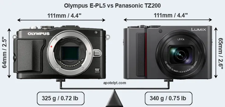 An illustration of the physical size and weight of the Olympus E-PL5 and the Panasonic TZ200 is provided in the side-by-side display below. The two cameras are presented according to their relative size. Three successive views from the front, the top, and the rear are shown. All width, height and depth dimensions are rounded to the nearest millimeter.