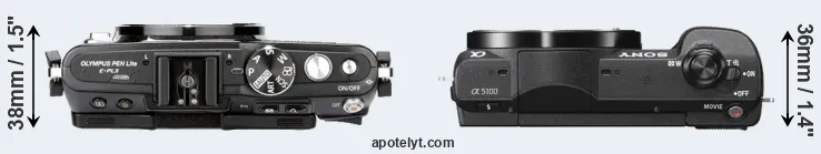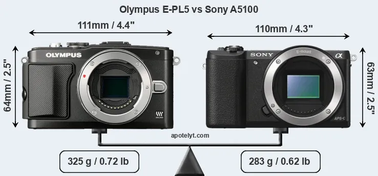 The physical size and weight of the Olympus E-PL5 and the Sony A5100 are illustrated in the side-by-side display below. The two cameras are presented according to their relative size. Three consecutive perspectives from the front, the top, and the back are available. All width, height and depth measures are rounded to the nearest millimeter.