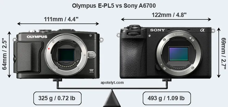 If the front view area (width x height) of the cameras is taken as an aggregate measure of their size, the Sony A6700 is notably larger (18 percent) than the Olympus E-PL5. Moreover, the A6700 is substantially heavier (52 percent) than the E-PL5. It is noteworthy in this context that the A6700 is splash and dust-proof, while the E-PL5 does not feature any corresponding weather-sealing.