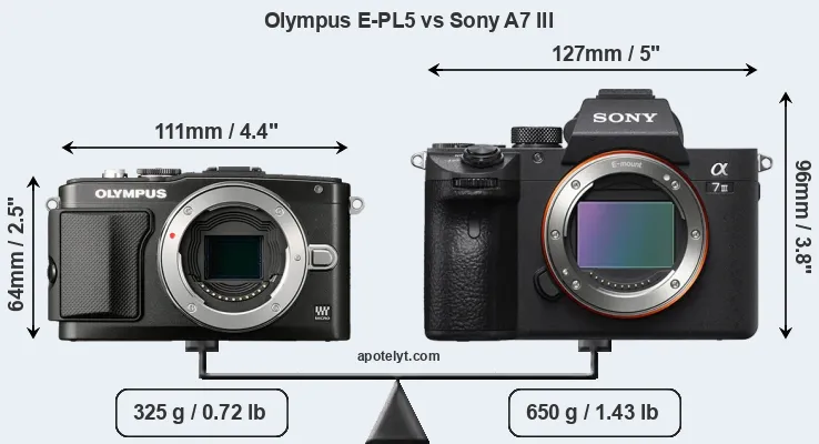 If the front view area (width x height) of the cameras is taken as an aggregate measure of their size, the Sony A7 III is considerably larger (72 percent) than the Olympus E-PL5. Moreover, the A7 III is substantially heavier (100 percent) than the E-PL5. It is noteworthy in this context that the A7 III is splash and dust-proof, while the E-PL5 does not feature any corresponding weather-sealing.